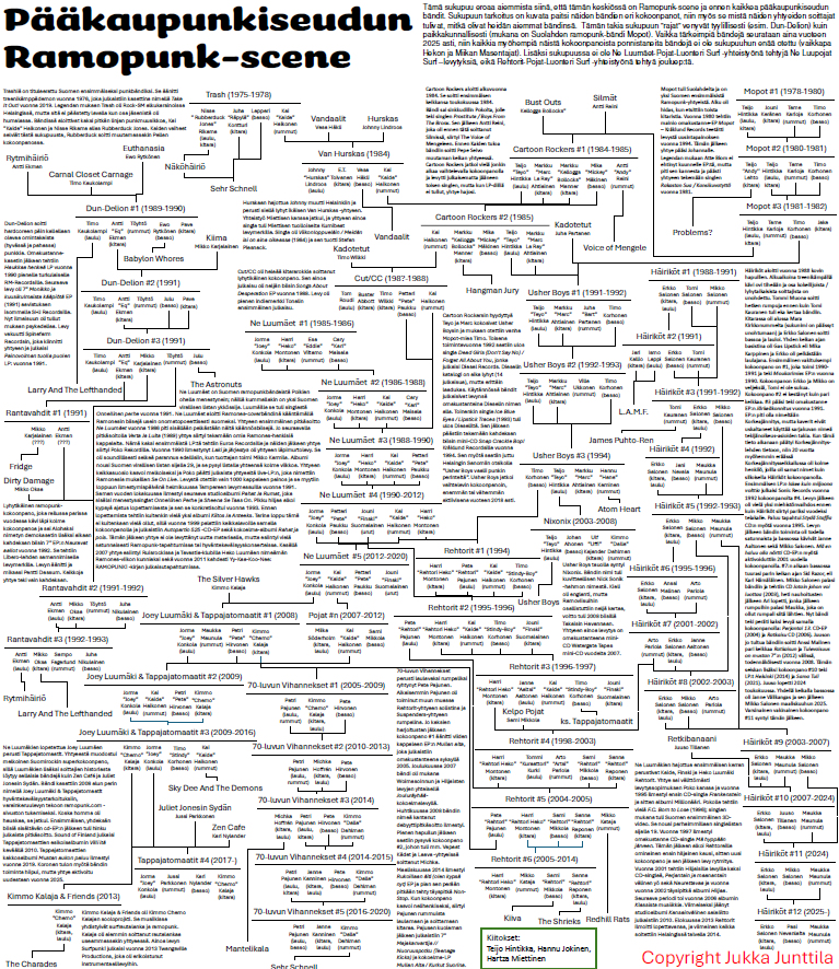 Sitten jotain muuta! Tällä kertaa rajaus ei ole kaupunki – tai no kyllä tämä etupäässä sisältää vain pääkaupunkiseudun bändejä – vaan scene. Ramopunkbändejä tuli toki ympäri maan, ja iso osa niistä on jo käsitelty omien kaupunkiensa kohdalla, mutta Helsingistä tuli useampi merkittävämpi tämän tyylisuunnan yhtye. Tämä sukupuu kertoo sen mistä näiden bändien muusikot ovat aloittaneet ja kuinka on scenessä siirtyneet bändistä toiseen. Viivoja on taas aika paljon, mutta eiköhän tuo varsin luettava ole.