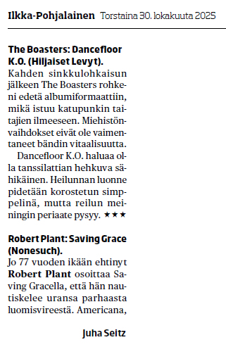 Ilkka-Pohjalaisen numerossa 30.10.2025 oli Juha Seitzin kirjoittama arvostelu Dancefloor K.O.:sta.