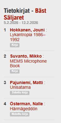 Kirjaa myy ennakkoon todella hyvin ja jo viikkoa ennen kuin se edes tulee kauppoihin on se Levykauppa Äxän tietokirjojen ykkönen pelkällä ennakkomyynnillä.